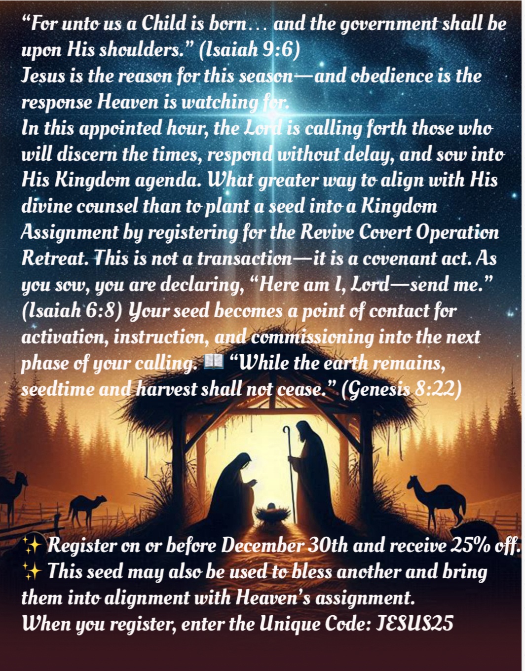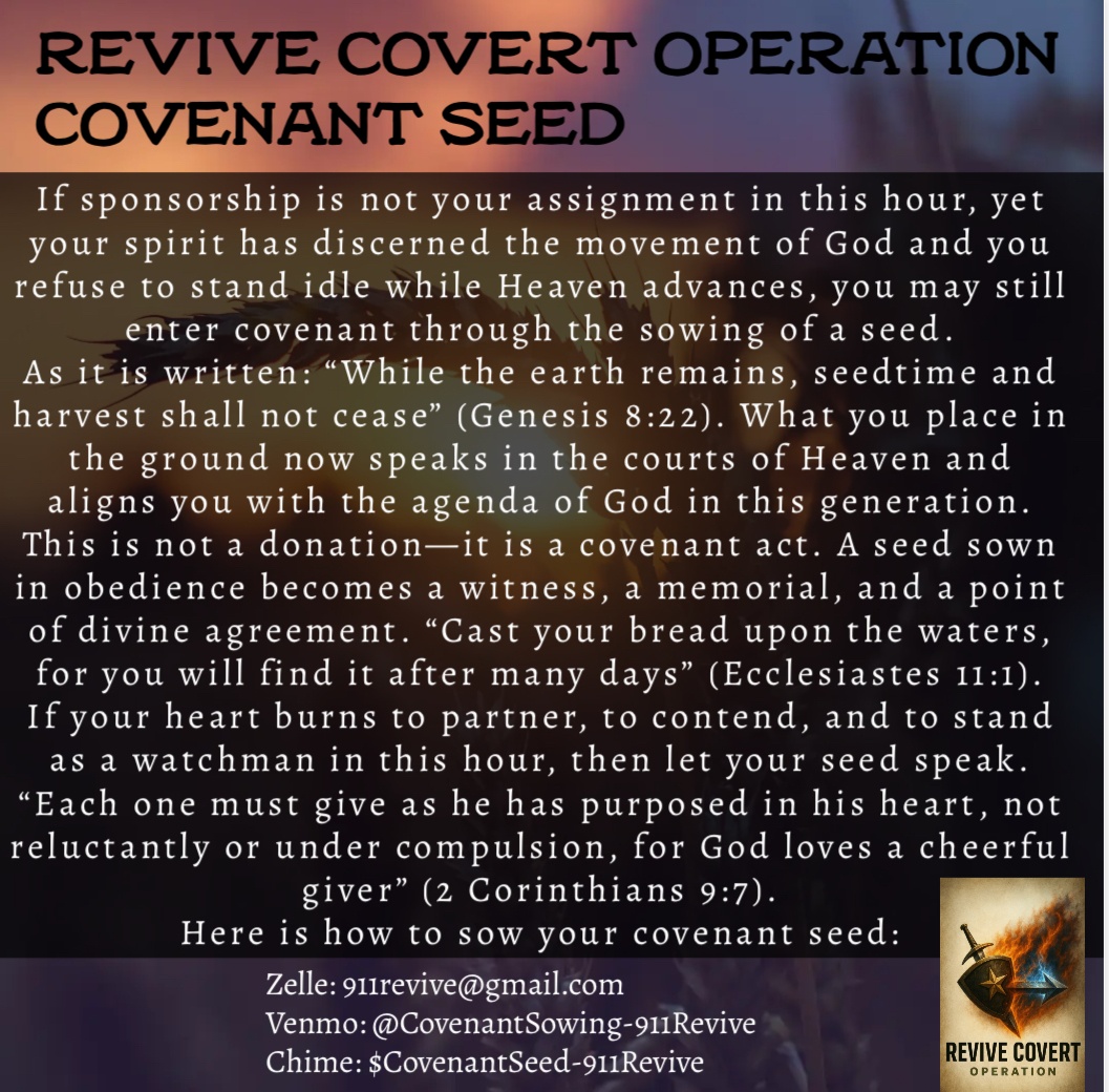 When you sow a $300 covenant seed into 911Revive for the Revive Covert Operations Retreat, your business, ministry, or organization will be featured and proclaimed as aligned with God’s Kingdom work on the retreat website. This is your banner. This is your testimony. As a covenant partner, you will receive a unique code for 10% off retreat registration, which is a tangible mark of honor, blessing, and divine favor for those who step boldly into this mission. This is more than sponsorship; it is a prophetic decree. A covenant step into a movement where Heaven itself is moving. “Whoever refreshes others will themselves be refreshed” (Proverbs 11:25)
